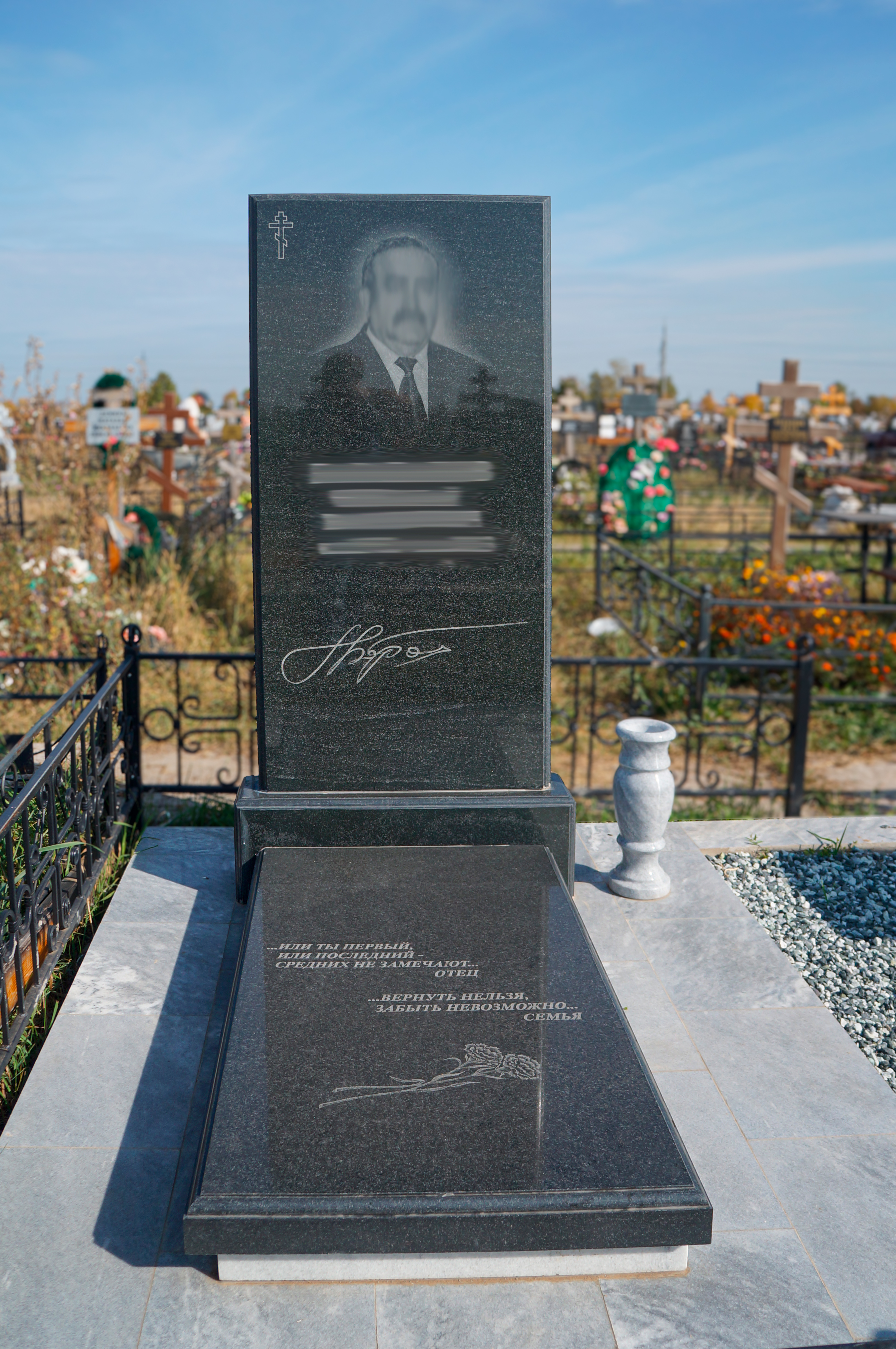 Дополнительно оплачиваются: гравировка (портрет, ФИО+даты, крестик, эпитафия, цветы), подготовка комплекта, оградка, установочные работы, доставка