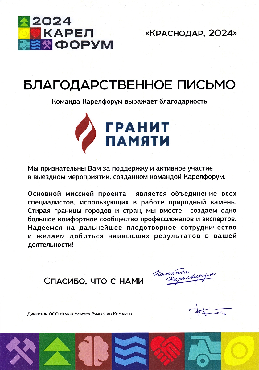 Ежегодные экспоненты профильных выставок в России «Некрополь», «Карелфорум», «Белый Тополь», «Ритуальные услуги. Камнеобработка» и в Белоруссии «Мемориал. Камнеобработка». Деятельность компании отмечена отраслевыми наградами: победители в номинации «медийность» в конкурсе «Золотая медаль Некрополь 2021», победители народного голосования на звание «Лучшая франшиза 2020», обладатели «Золотого скарпеля», номинанты на звание «Лицо Отрасли Некрополь 2020». Сотрудница компании признана «Самой обаятельной в каменной отрасли 2022».